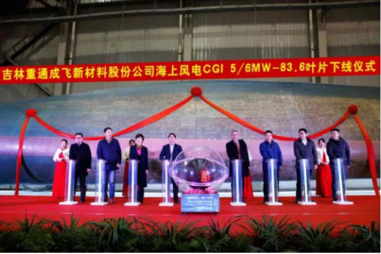 2018年2月6日,吉林重通成飛新材料公司開(kāi)發(fā)出國(guó)內(nèi)最長(zhǎng)海上風(fēng)電CG15/6MW-83.6米葉片,并在江蘇如東成功下線(xiàn)..