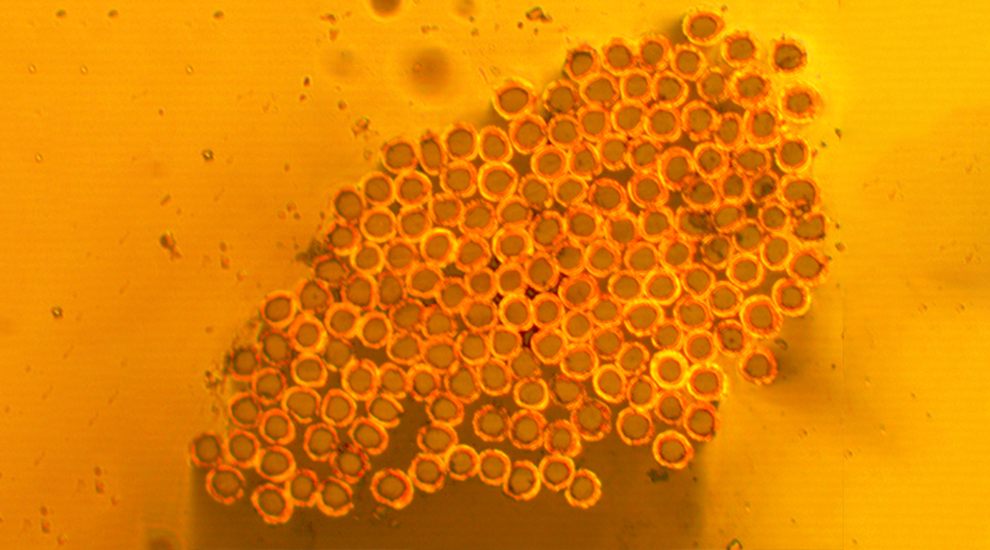 大連義邦Syscom鍍金屬纖維絲,采用專有的化學(xué)電鍍工藝,將金屬涂層與基材牢固的結(jié)合在一起,通過電鏡觀察,一股PBO纖維有166根,下述圓形代表纖維的橫截面,圓環(huán)代表金屬涂層,通過觀察,發(fā)現(xiàn)一股PBO纖維里面的166根,每根都有圓環(huán)包覆,均勻且牢固的與非金屬基材結(jié)合在一起,金屬結(jié)合度高達(dá)80%以上,因此在實(shí)際使用的過程中,不會因?yàn)榉磸?fù)摩擦,清洗,導(dǎo)致金屬涂層脫落,影響導(dǎo)電性,屏蔽性。